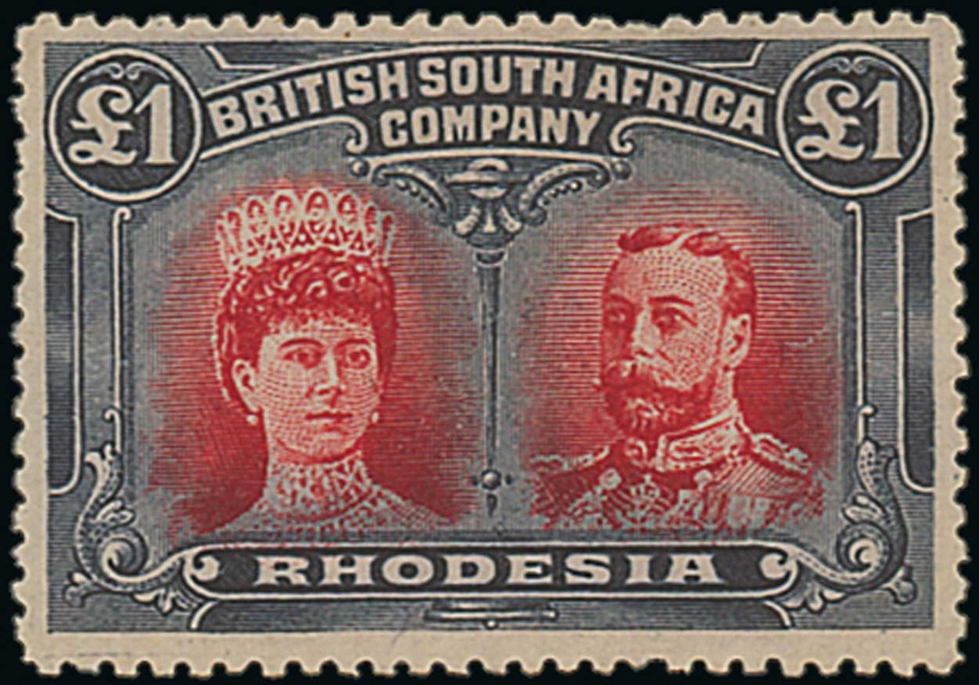 £1 rose-scarlet and bluish black, fresh with large part original gum; one shortish perf. at top, otherwise fine. S.G. 166, £1,600. Photo