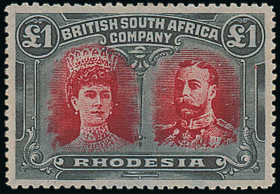 £1 crimson and slate-black, fresh and lightly mounted mint, well-centred and a very fine example of this scarce shade. S.G. 166a, £2,000. Photo