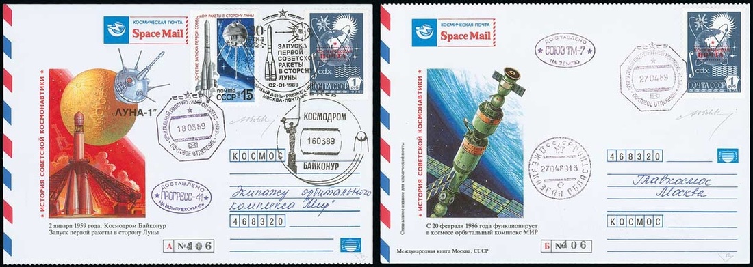 1980-89 five Cosmanought covers/cards, including 1981 (22 March) joint Soviet-Mongolian spaceship, signed V. Dzhanibekov, 1981 (12 April) "Salyut 6" flight cover signed V. Koyalenok and V. Savinyh, 1989 (March and April) "Mir" cards (406 of 500 issued), one signed by the crew Krikalev, Volkov and Polyakov, fine and rare. With a selection of certificates. Photo