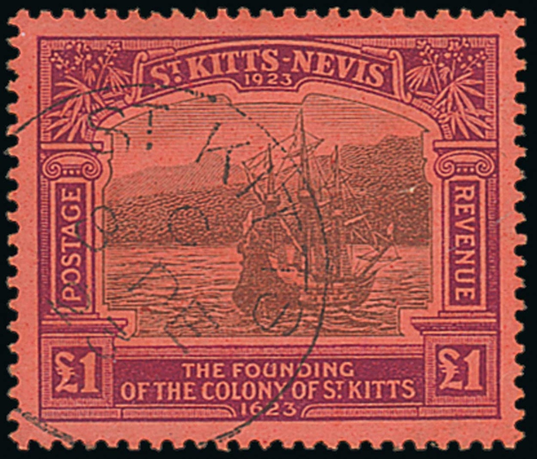 1923 Tercentenary £1 black and purple on red, neatly cancelled with St. Kitts December 1923 datestamp; very fine. S.G. 60, £1,600. Photo