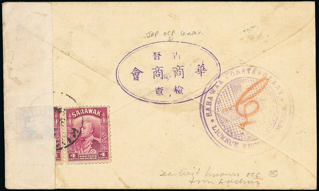 1942 (15 May) envelope to Singapore, bearing on reverse 1934-41 4c. bright purple (2), cancelled with Kuching c.d.s., showing