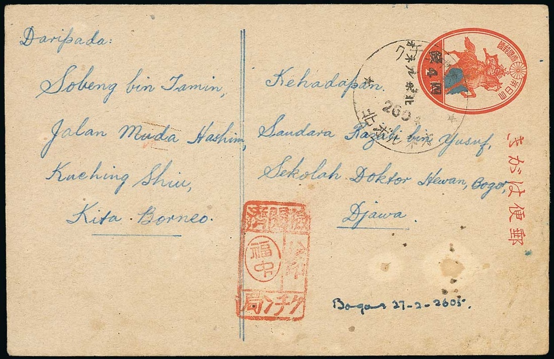 1944 (16 Nov.) Japanese 4s. on 2c. stationery card cancelled by Kuching Japanese c.d.s. (Type JD4) and showing red censor chop; the card with a couple of minor blemishes. Rare. Photo