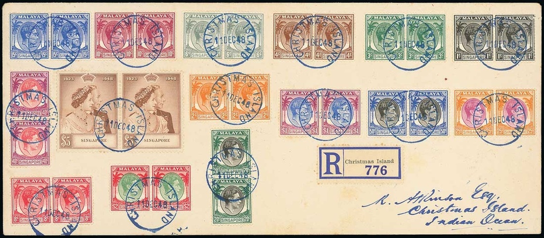1948 (11 Dec.) envelope (265x115mm.) registered from Christmas Island and addressed locally, bearing 1948 perf. 14 1c. to $2 and Wedding $5 in pairs with each neatly cancelled by