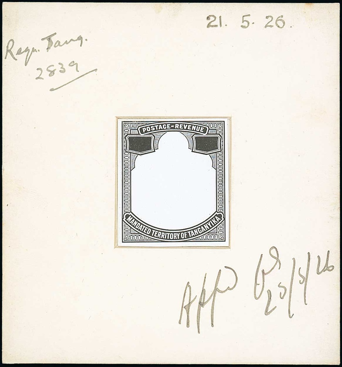 1s/£1 stamp-size master with blank vignette and uncleared value tablets in black on glazed card, inset on thick card (84x90mm.) dated "21.5.26", marked "Reqn Tang 2839" and "Appd", initialled and dated "25/5/26", fine. Photo