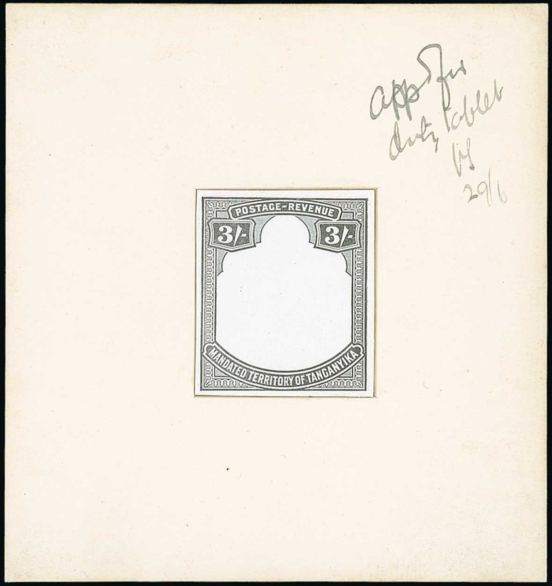3/- frame in black, mounted on die sunk card (85x90mm.) endorsed "Appd for duty tablet 29/6" and initialled, violet Thos. de La Rue handstamp on reverse; fine. Photo