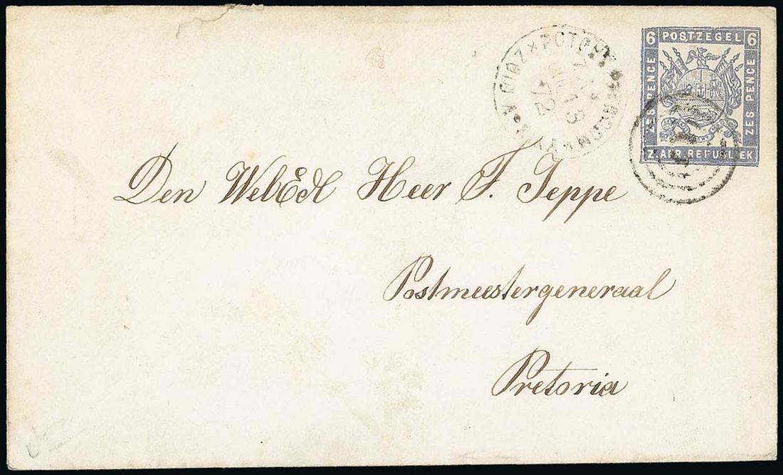 1872 (13 July) 6d. blue stationery envelope from Potchefstroom to Friederich Jeppe, Postmaster-General, at Pretoria, cancelled with four-ring target and with datestamp alongside, the reverse (flap repairs) with arrival datestamp (18.7). A rare and most unusual usage of this envelope. Photo