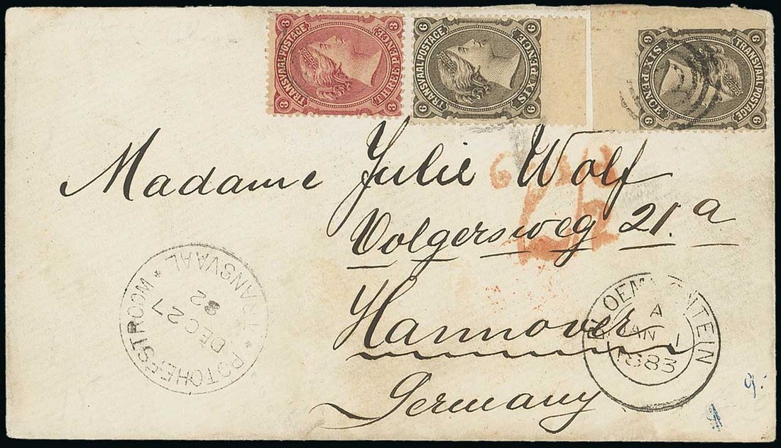1882 (27 Dec.) envelope from Potchefstroom to Germany, bearing 1878-80 3d. dull rose and 6d. black-brown marginal and corner examples, all cancelled with four-ring target and showing despatch and Bloemfontein (1.1.83) datestamps and "2½d" accountancy handstamp in red, all on face, the reverse with Cape Town, London and arrival (30.1) datestamps. Scarce and attractive. Photo
