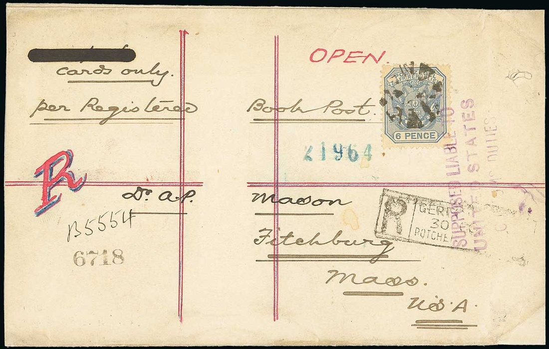 1896 (30 Oct.) "Registered Book Post" envelope from Germiston to U.S.A. and containing "cards only", bearing 1895 6d. pale dull blue cancelled with cork obliterator, registration handstamp below and showing "