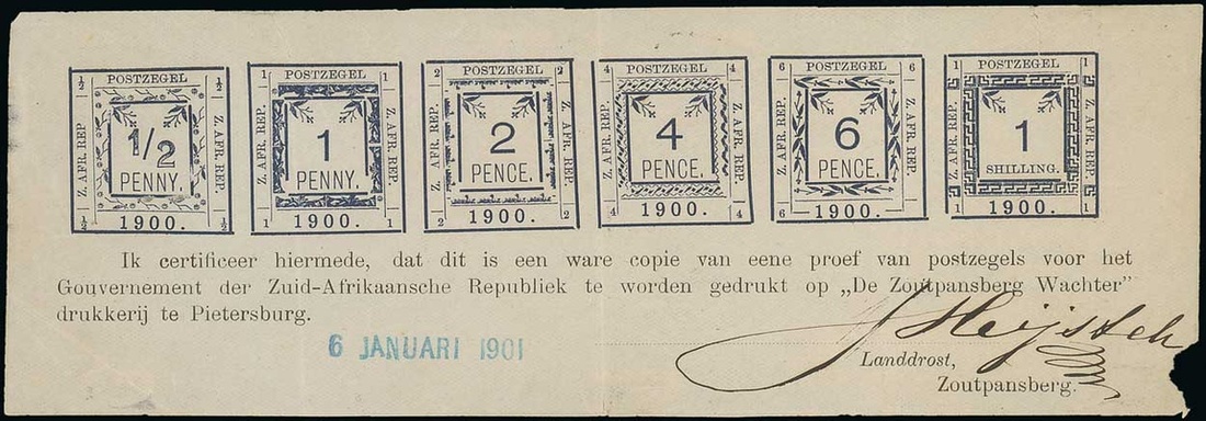 ½d. to 1/- essay strip of six in blue on wove paper (200x74mm.) with printed note below and signed by the Postmaster at Zoutpansberg;  small fault in lower right corner, otherwise fine. Photo