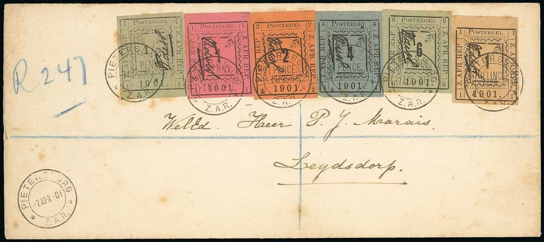 ½d. to 1/- Type P1 set of six each neatly cancelled and tied on 1901 (7 Apr.) envelope (230x101mm.) registered to Leydsdorp;  a few small fox marks, otherwise fine. Photo