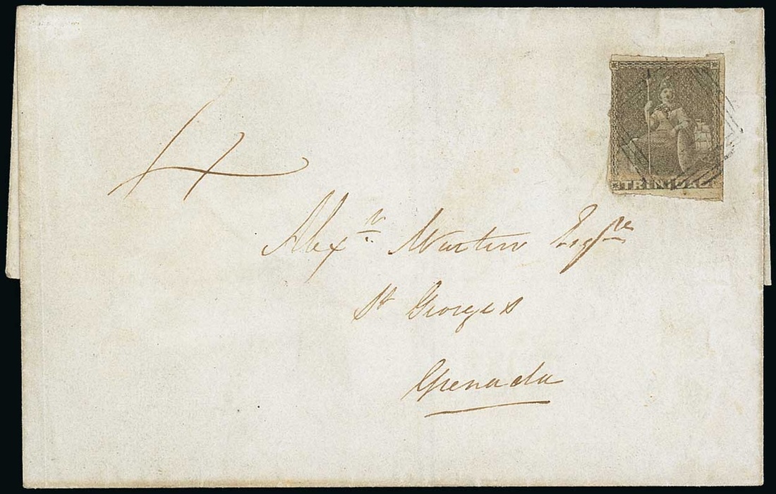 1853 (April) entire to Grenada franked 1851-55 (1d.) brownish grey (faults at left) tied by "1" boxed cancellation, manuscript 4, dated markings on reverse including arrival (10.4); scarce. Photo