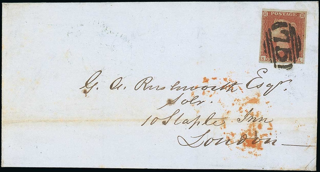 Plate 174: SL small to large margins all round, tied by "75 barred oval of Birmingham to entire, dated 6 Feb. 1854 to London; horizontal filing fold clear of the adhesive. Rare on cover. Photo