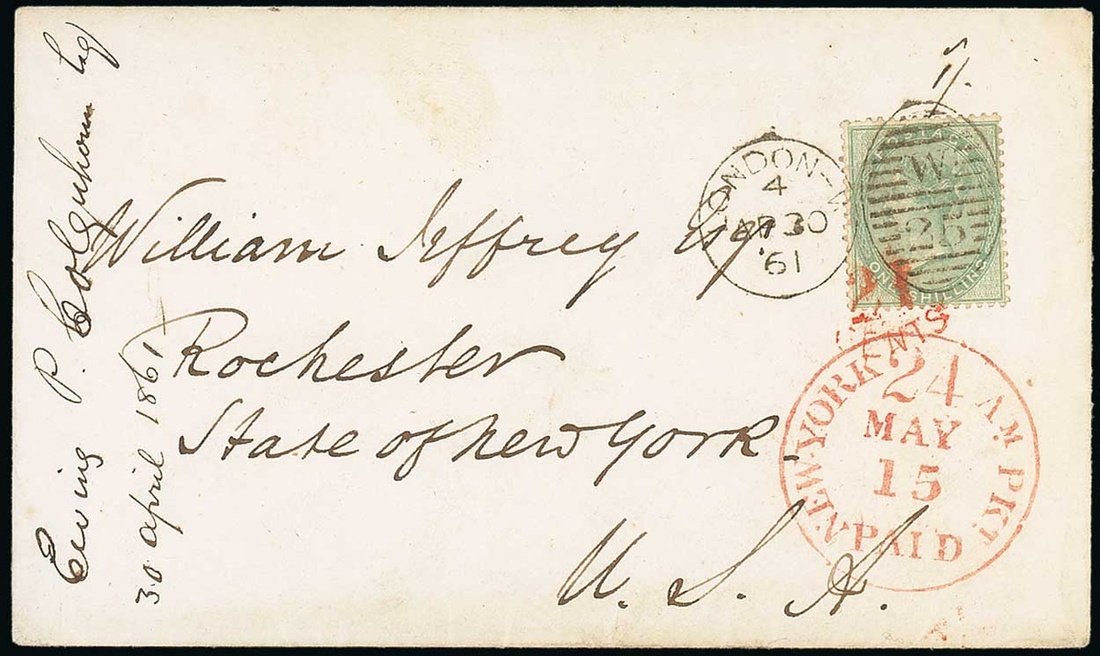 1855-57 1/- green, tied by London W/25 Duplex of 30 April 1861 to envelope to New York, red "21/cents" additionally ties the 1/- and with red