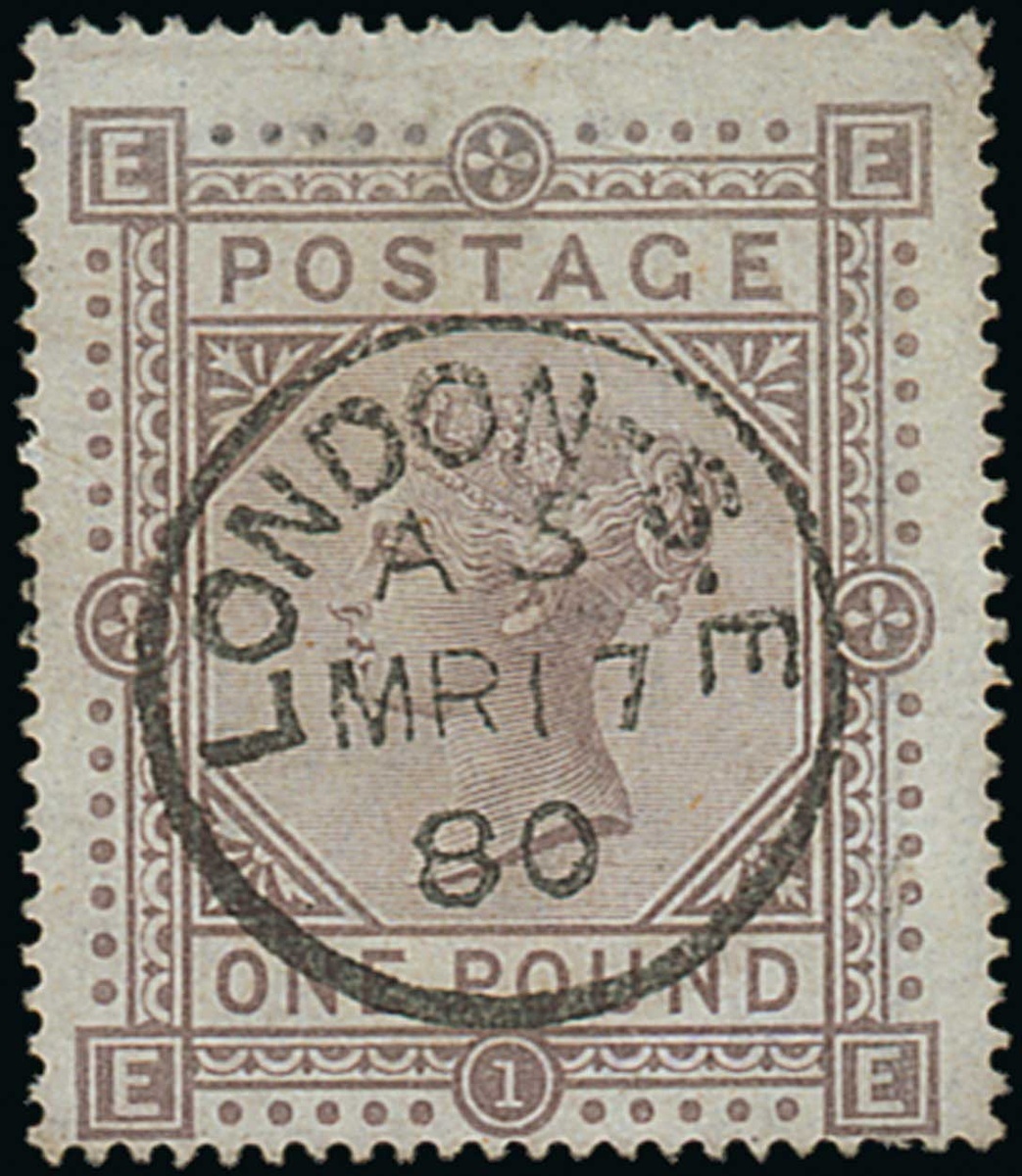 1867-83 watermark Maltese Cross £1 brown-lilac, EE, central London S.E. c.d.s. of 17 March 1880, slightly pale colour and a trifle soiled but a sound and very presentable example of this rare high value. S.G. 129, £4,500. Photo