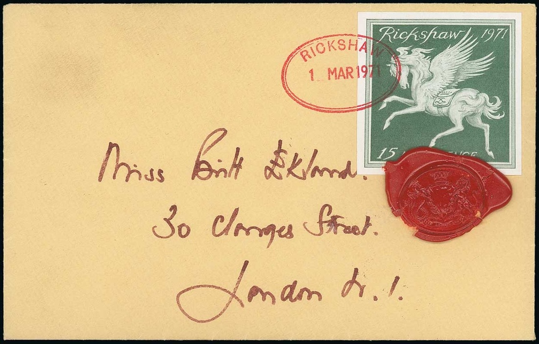 1971 Strike Post, "Rickshaw" (organised by Lord Patrick Lichfield) 15p. green, tied by oval red