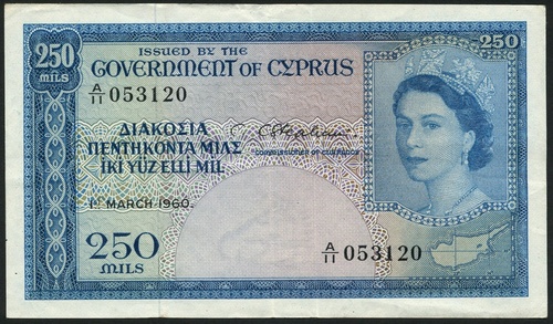 (x) Government of Cyprus, 250 mils, 1 March 1960, serial number A/11 053120, blue on multicolour underprint, Elizabeth II at right, map of Cyprus at low right