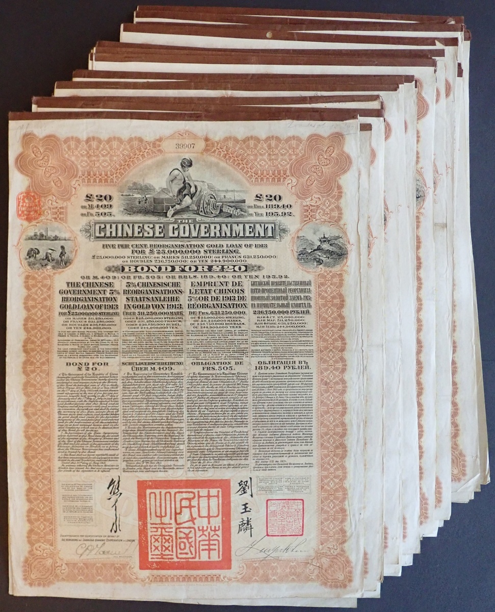 China: 1913 5% Reorganisation Gold Loan, a group of 46 bonds for £20, issued by HSBC, Mercury at top, brown, with coupons. Generally VF, a few better (46).