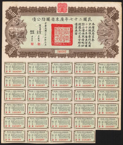 China: A Miscellaneous collection of Internal Loans, comprising Kwang-Tung Public Loan, 1912, bonds for $5, A and B, and $10; Ministry for Railways of Canton Hankow, 1930, bonds for 4, 40 and 100 yuan; 4% Kwangtung Military Loan, 1938, bonds for 10, 50 and 100 yuan; 1931, Nationalist Government 2nd Lottery Loan, 5 x 1 yuan; 1931 Kwangtung 2nd Military Loan, 5, 10 and 50 yuan; 1928 10% Nationalist (Kwangtung Government) Loan, 1, 10 and 100 yuan; 1926 Lottery Loan, 5 yuan; 1927 Lottery Loan, 5 yuan, and, 1926 2nd Nationalist Lottery Loan, 5 yuan. Mostly F-VF, a few better (19).