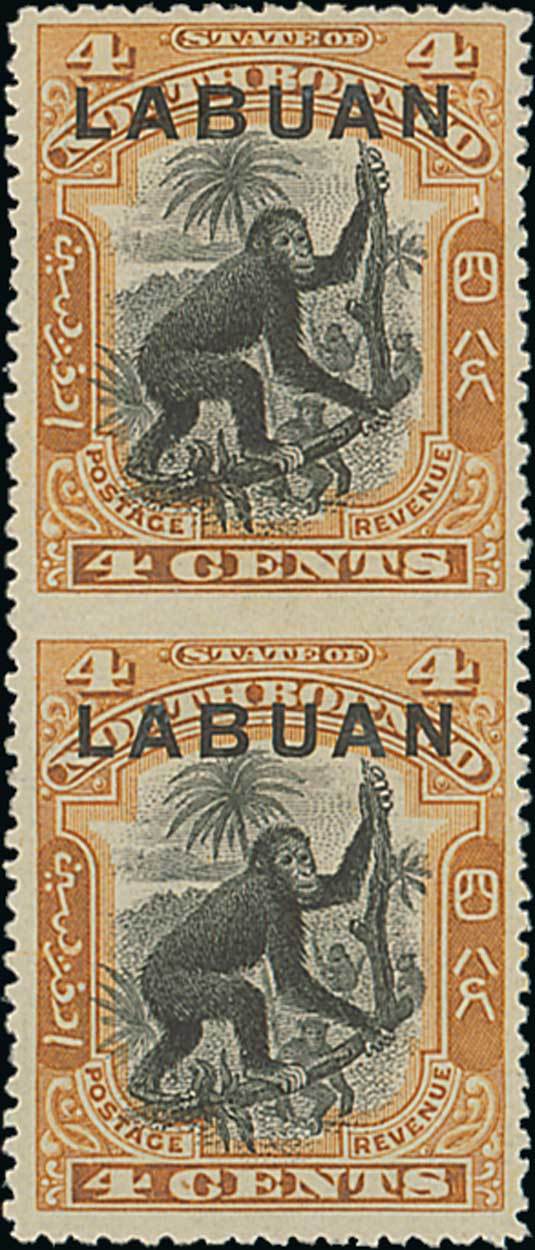 1900-02 4c. black and yellow brown vertical pair, variety imperforate between, fresh mint, fine and rare. S.G. 112a, £1,400. Photo