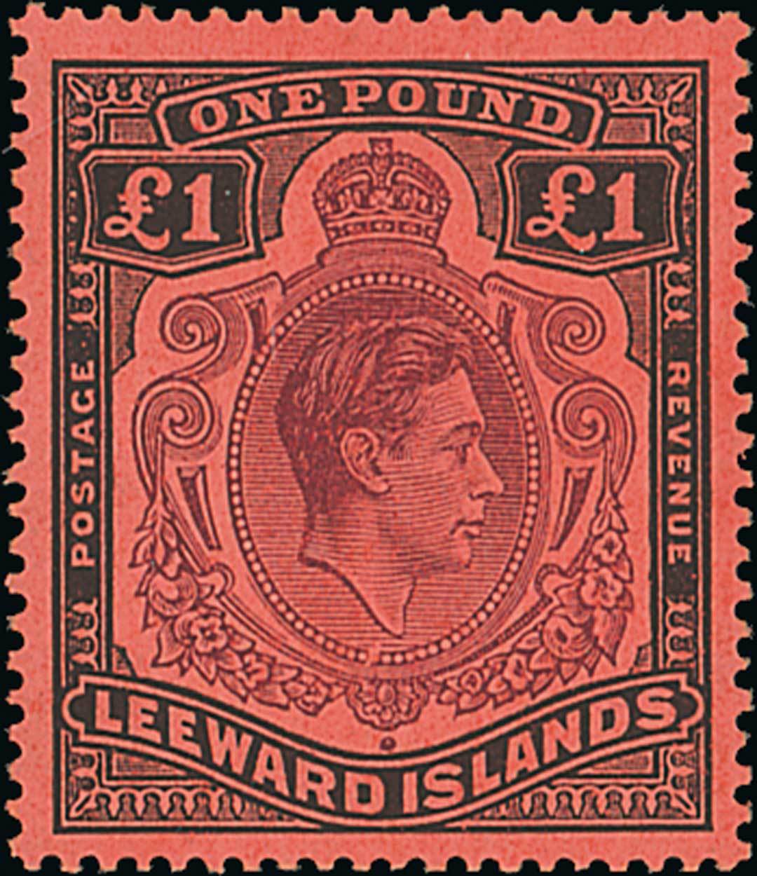 1938 £1 brown-purple and black on salmon, Row 5/1 missing pearl, fresh and very fine mint. Ceremuga Certificate (2016). S.G. 114ba, £1,700. Photo
