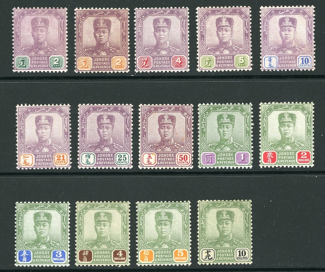 1918-20 Sultan Sir Ibrahim 2c. to $10 green and black set of fourteen, fresh mint, odd minor blemish though a fine set overall, rarely offered complete. S.G. 89-102, £750
