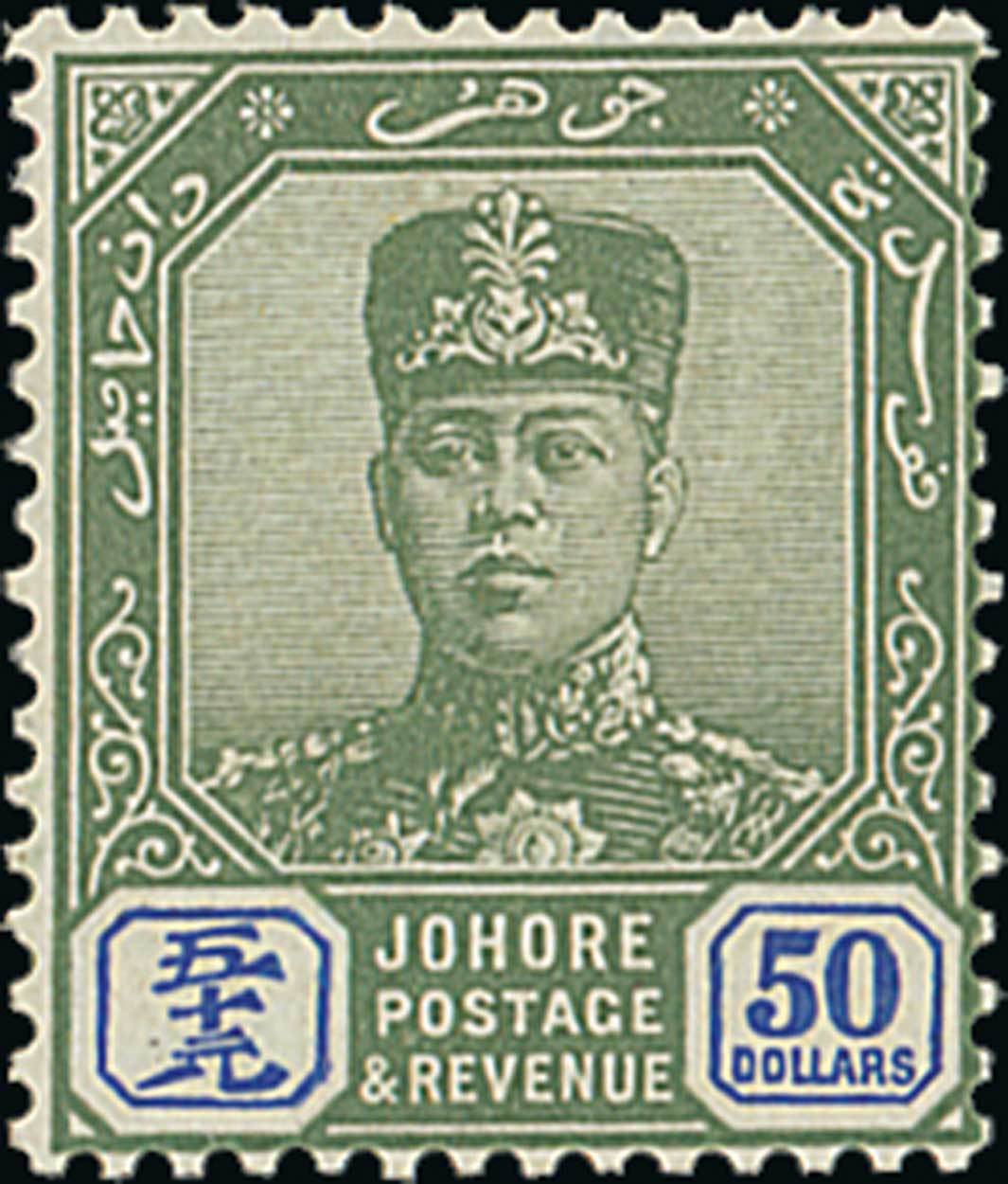 1922-41 Sultan Sir Ibrahim $50 green and ultramarine, very fine mint with fresh colours. S.G. 126, £1,500. Photo