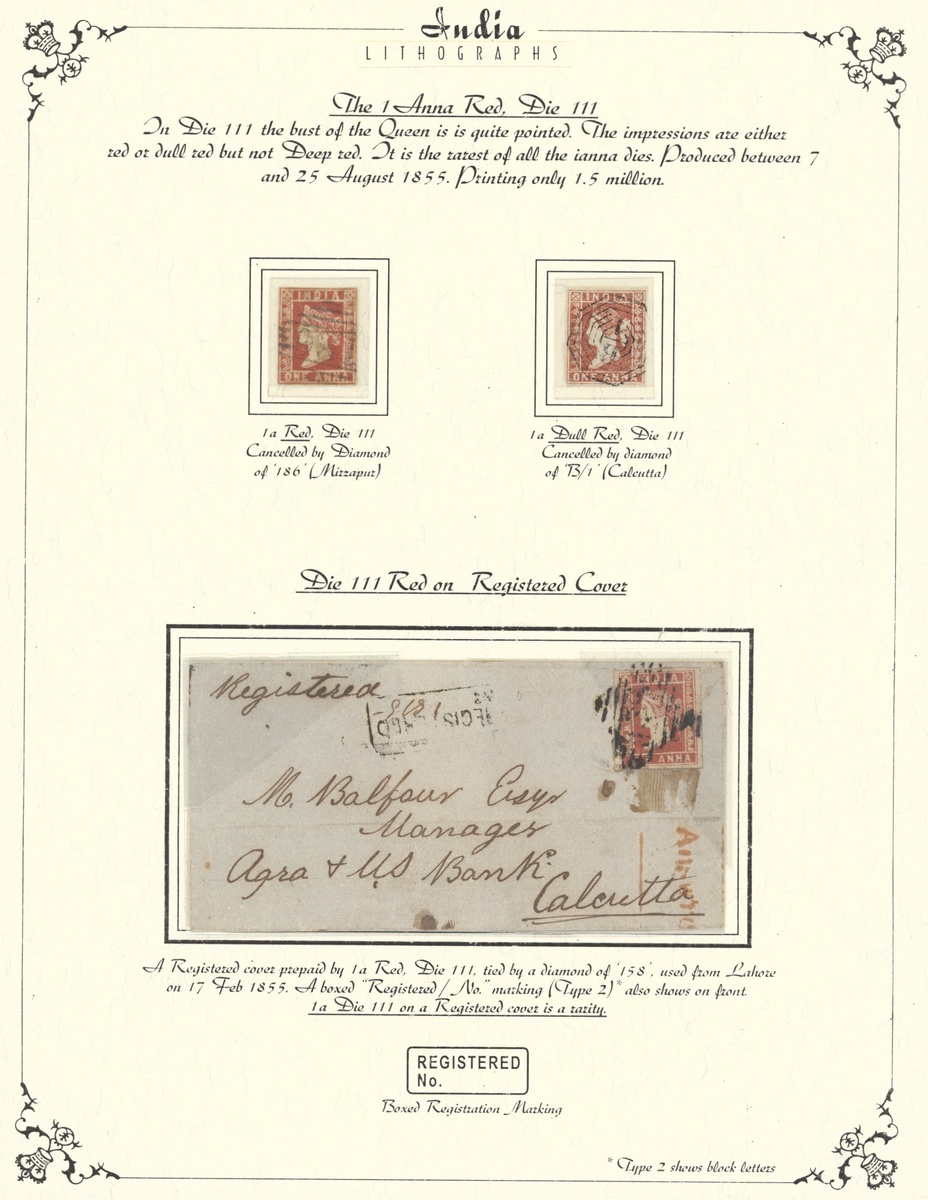 1a. Die III, good to large margins and tied with indistinct numeral cancellations on large part entire registered to Calcutta, and two other examples, one poor, the other of fine appearance with four margins and neatly cancelled "B/1"
