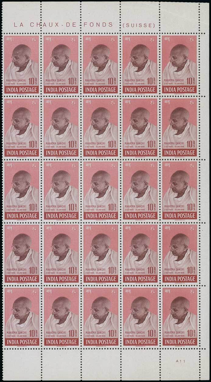 1948 Gandhi 10r., a right side block of twenty-five with margins on three sides and showing plate number at lower right, fresh unmounted mint, light diagonal crease across top right corner of selvedge which in no way detracts from the magnificent appearance of this impressive multiple. S.G. 308. Photo