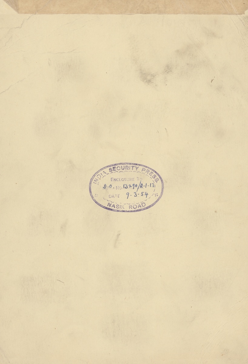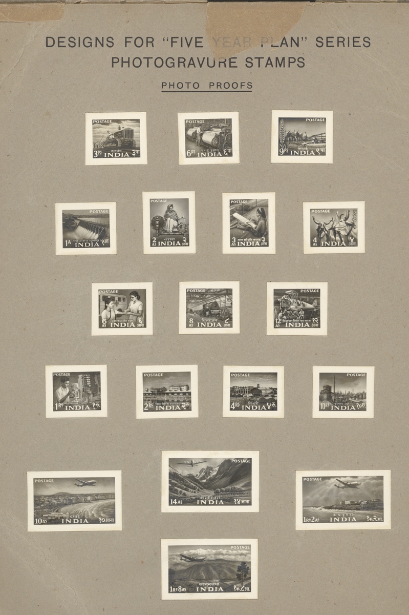 1954 card sheet (228x305mm.) headed "Designs For "Five Year Plan" Series Photogravure Stamps" and bearing "Photo Proofs" of eighteen values, fourteen as issued, the 6a. in small unissued format showing two women and ambulance, and 4r. in small format showing the Sindri Fertilizer Factory as used on the issued 5r.; card with minor creasing at foot and with tracing paper overlay damaged though a most unusual proof sheet