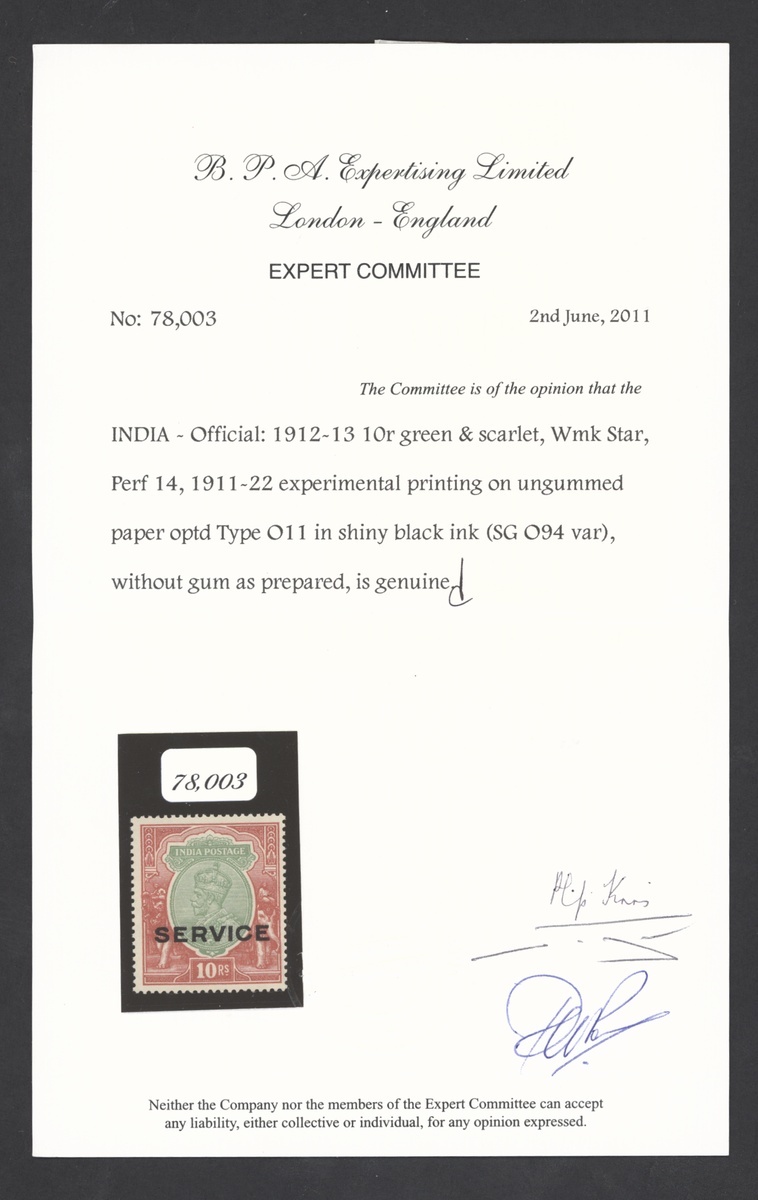 1912-13 10r. green and scarlet experimental printing on ungummed paper with overprint in shiny black ink; fine and scarce. B.P.A. Certificate (2011). Photo