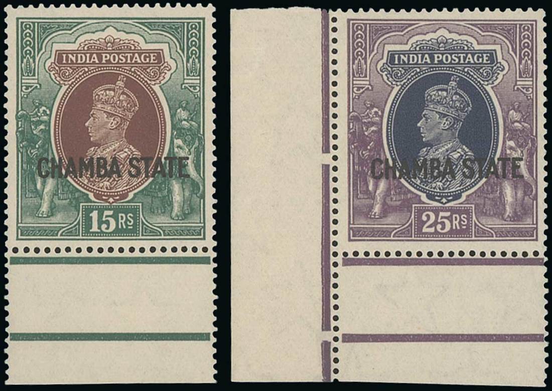 1942-47 2r. to 25r., the 15r. with rare variety watermark upright, all marginal or corner examples, unmounted mint; off-white gum as usual with so many of these high values. S.G. 102-05, 106w, 107, £1,188. Photo for 15r.
