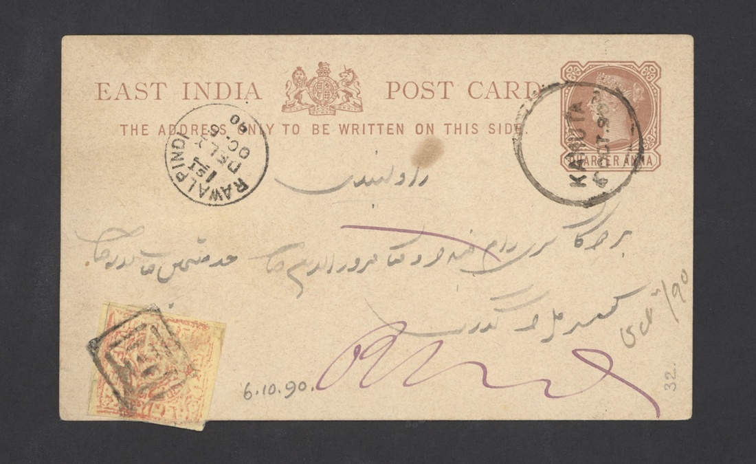 1890 (Oct.) India ¼a. brown card from Kahuta to Rawalpindi and bearing 1885-94 1p. red on yellow wove bâtonné (affixed slightly over edge with boxed cancellation, arrival datestamp above; a couple of faults though of good appearance