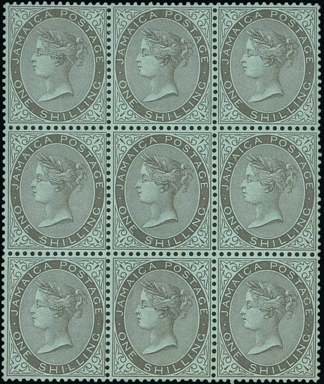 1905-11 1/- black and green block of nine, the centre stamp Row 2/2 variety