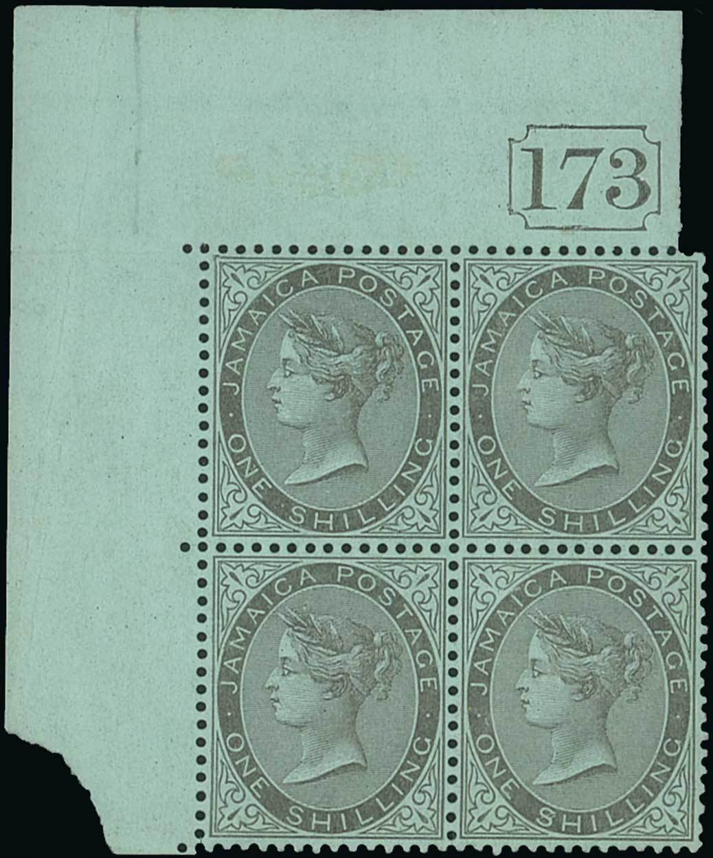 1905-11 1/- black and green upper left corner block of four with Current number "173", Row 2/2 variety