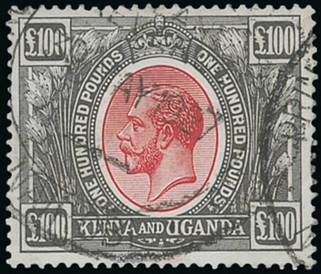 £100 red and black lightly cancelled with Nairobi Principal Registrar of Documents datestamp; tiny thin at upper left corner, otherwise fine and rare. S.G. 105, £2,250. Photo