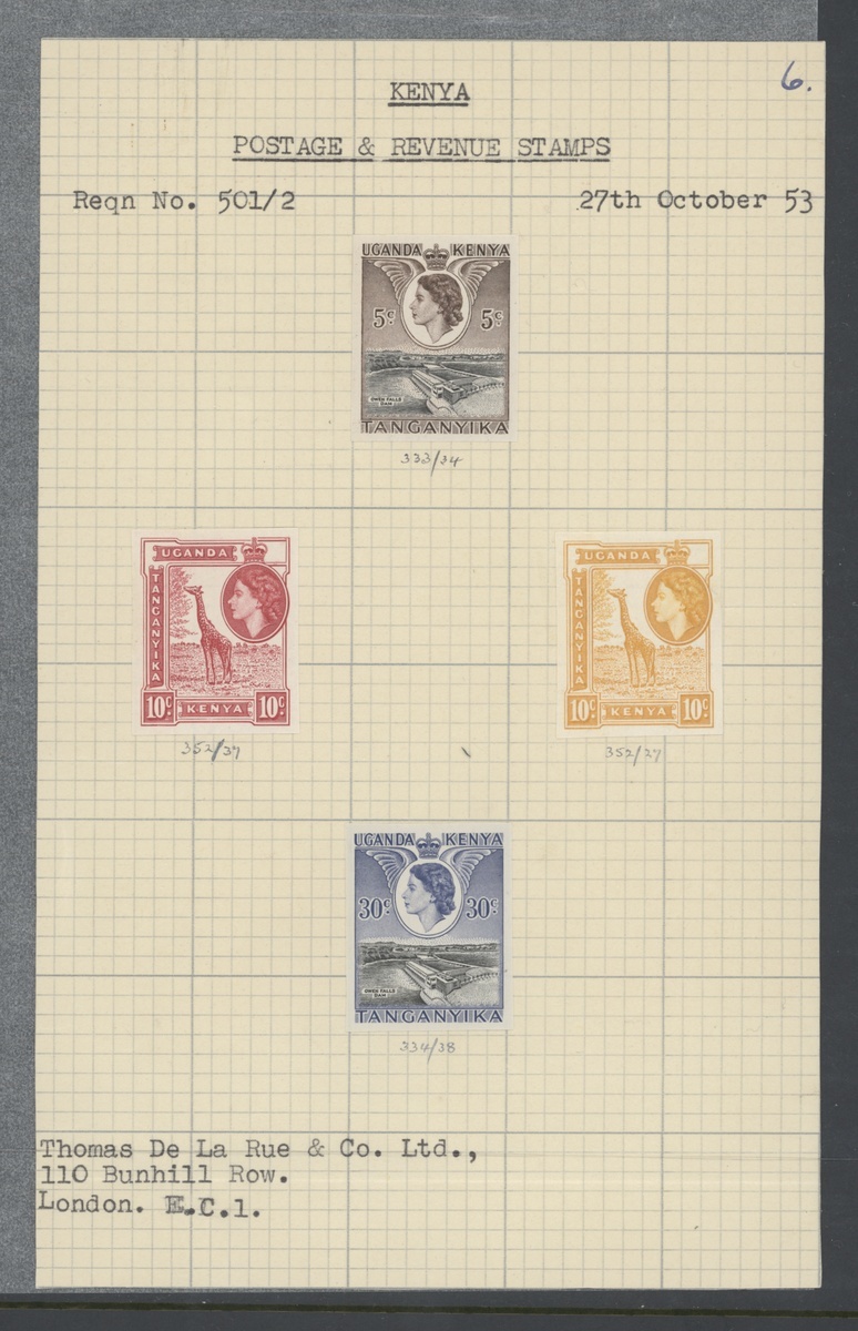 1953-63 a group of imperforate plate proofs affixed to De la Rue requisition sheet with 5c. black and deep brown, 10c. carmine-red, 10c. yellow-orange (not issued) and 30c. black and deep ultramarine. These proofs are on gummed paper from requisition 501/2 with manuscript working numbers under each stamp. Photo