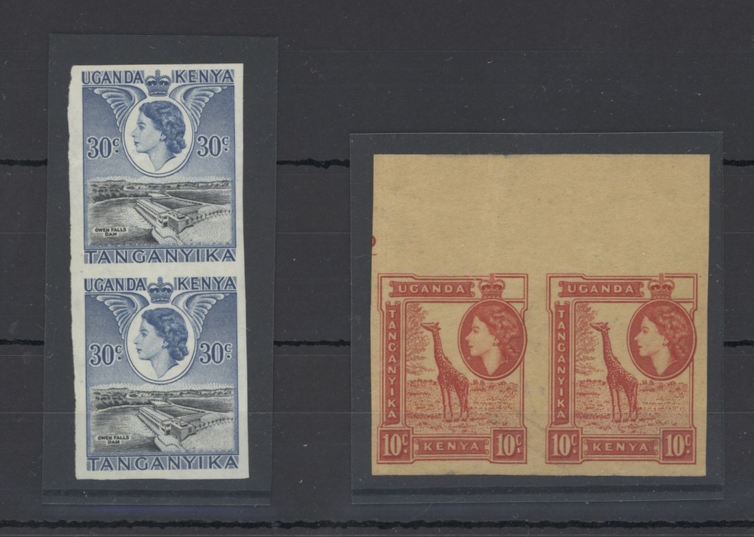1953-63 30c. black and deep ultramarine imperforate plate proof on gummed paper, a vertical pair; top stamp with small hinge remainder and horizontal crease. Also 10c. carmine-red imperforate printer’s proof on buff paper in a top margin horizontal pair