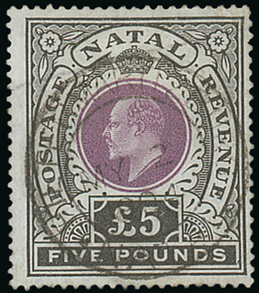 £5 mauve and black, neatly cancelled with Pietermaritzburg 1904 double-ring datestamp; fine and scarce. S.G. 144, £1,400. Photo