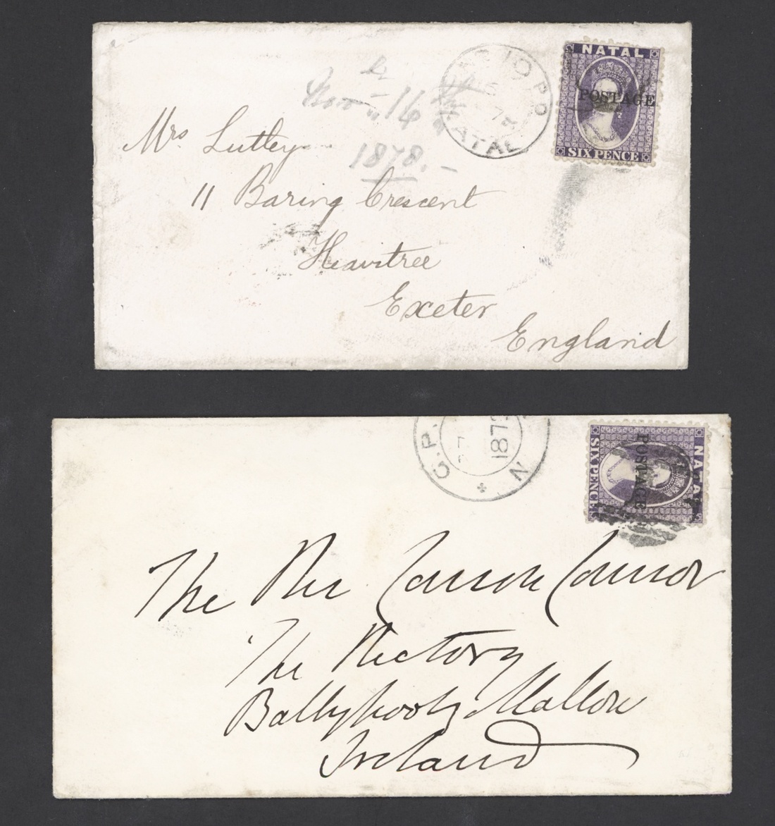 1879 envelope from Ladysmith, bearing 1876 Postage 6d. violet with indistinct cancellation and legible shield type 19 datestamp alongside, G.P.O. Natal, Bristol and Exeter datestamps on reverse, and 1879 envelope (no flap) from Pietermaritzburg to Ireland bearing 1876 Postage 6d. violet cancelled "1" and with part G.P.O. Natal datestamp alongside . S.G. 83