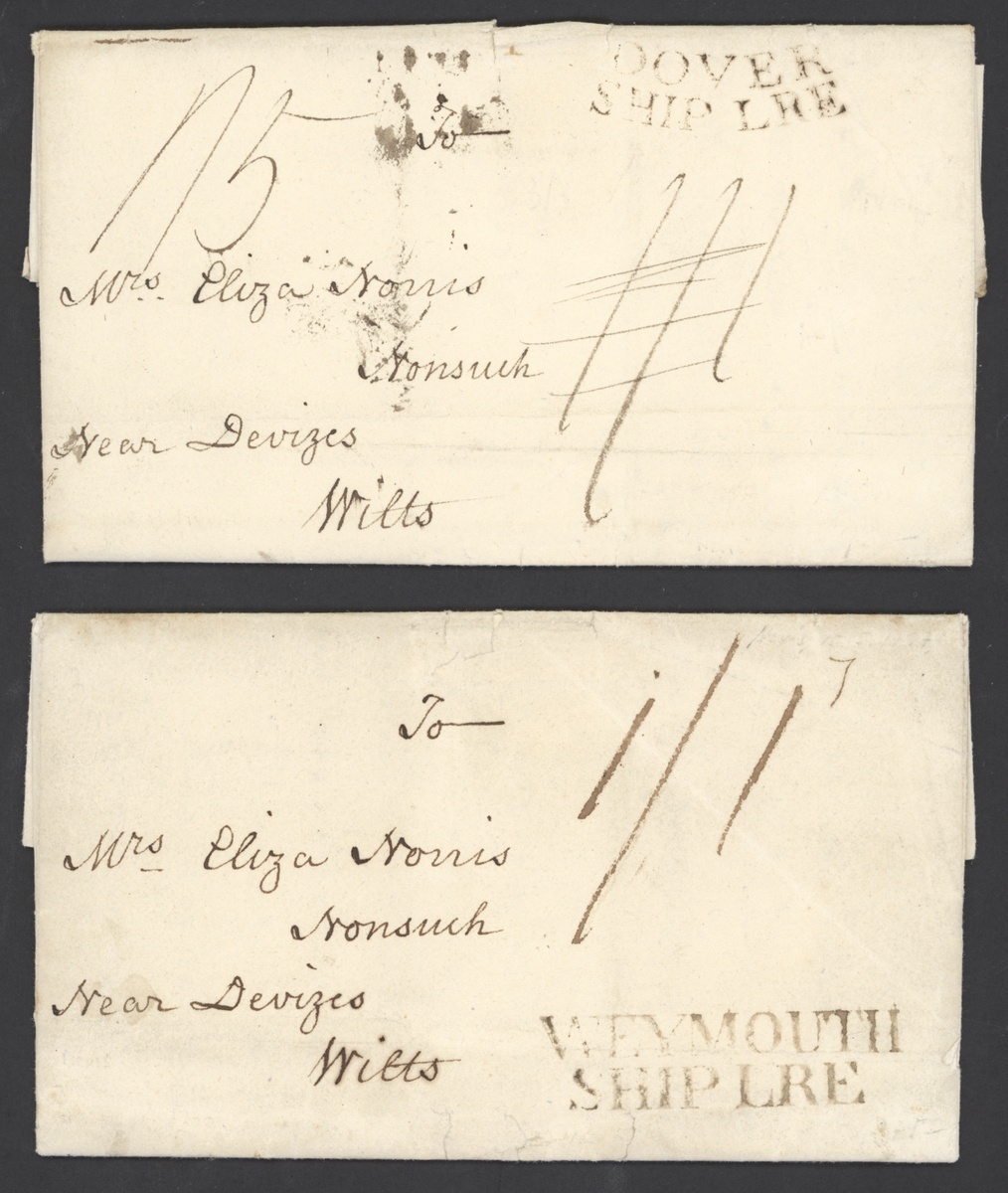 1797 (15 May) two entire letter from the same correspondence to Nonsuch, Wiltshire, both rated "1/11", one with