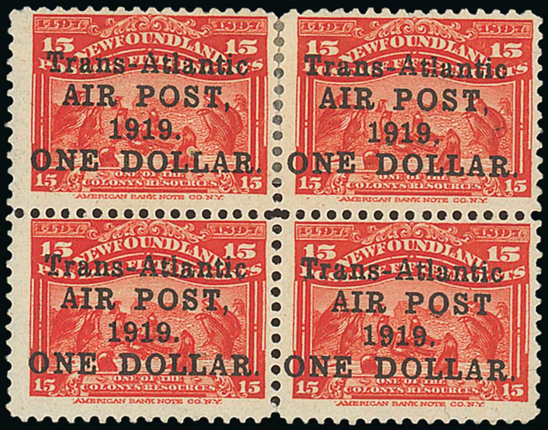 1919 Trans-Atlantic $1 on 15c, bright scarlet block of four with no comma afer
