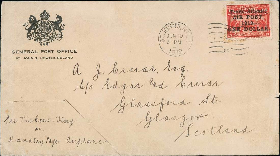 1919 (10 June) "General Post Office" envelope (with fine enclosure mentioning the flights and life in Newfoundland) to Glasgow, marked "Per Vickers Vimy or Handley Page Aeroplane", bearing "Trans Atlantic" $1 on 15c. tied by St. John's machine cancellation, as usual for mail outside London, no arrival datestamp; minor perimeter faults, small part of flap missing and a trifle soiled. Rare. Photo
