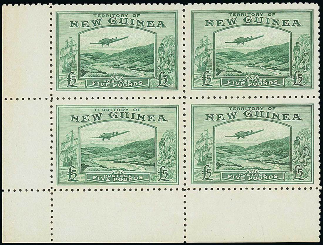 1935 Air £5 emerald-green lower left corner block of four, unmounted mint with off-white gum, fresh appearance and a rare and most attractive multiple of this scarce high value. S.G. 205, £3,000+. Photo