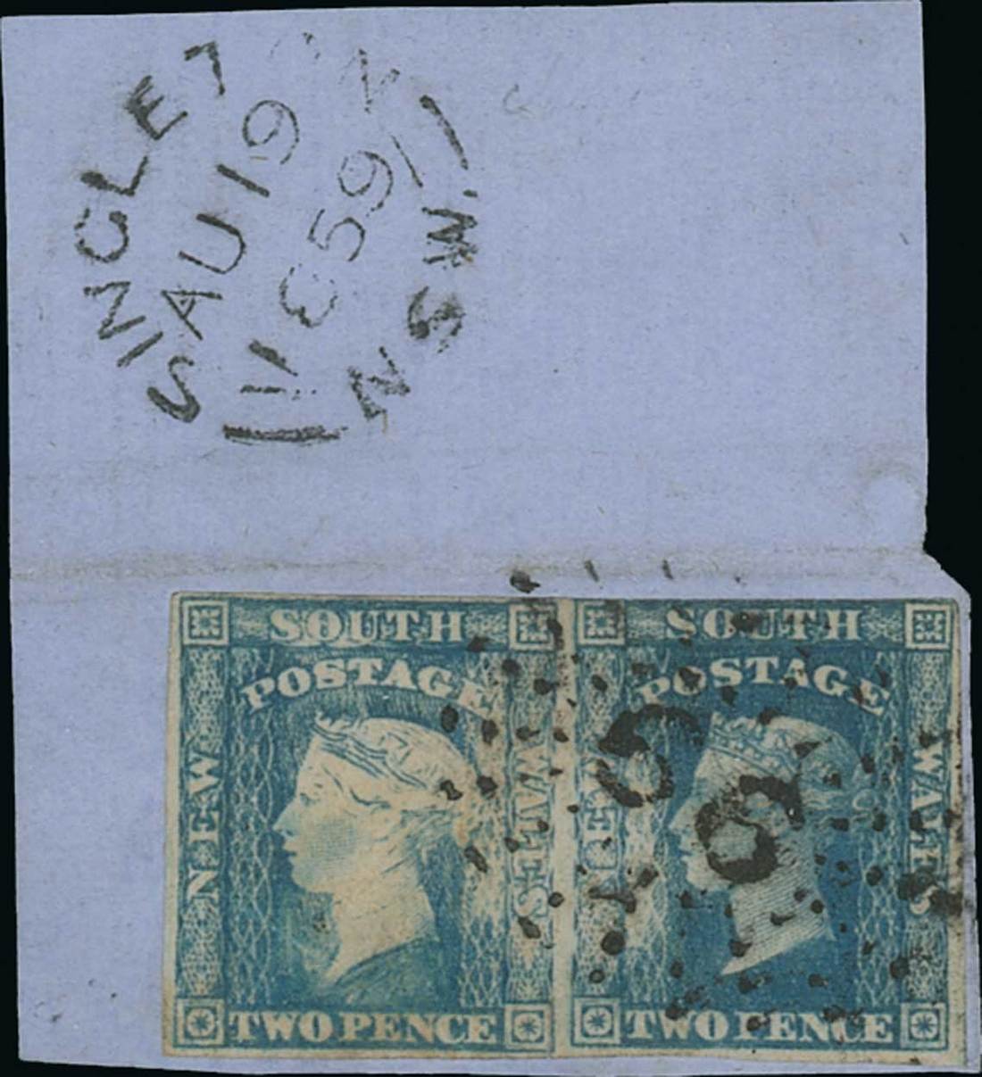 1857-60 Diadem, imperf. 2d. deep dull blue horizontal pair with second retouch, [104-105], [104] showing heavy retouching to base of neck and shading below, [105] showing a blistered impression, close margins on three sides, touched along top, tied to small piece by "66" in rays, and showing