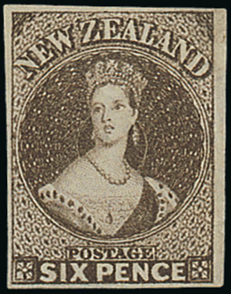 1862-64 Watermark Large Star, Imperforate 6d. black-brown with small to large margins, unused without gum, fine.  S.G. 42, £1,900. RPS of NZ Certificate (2017). Photo