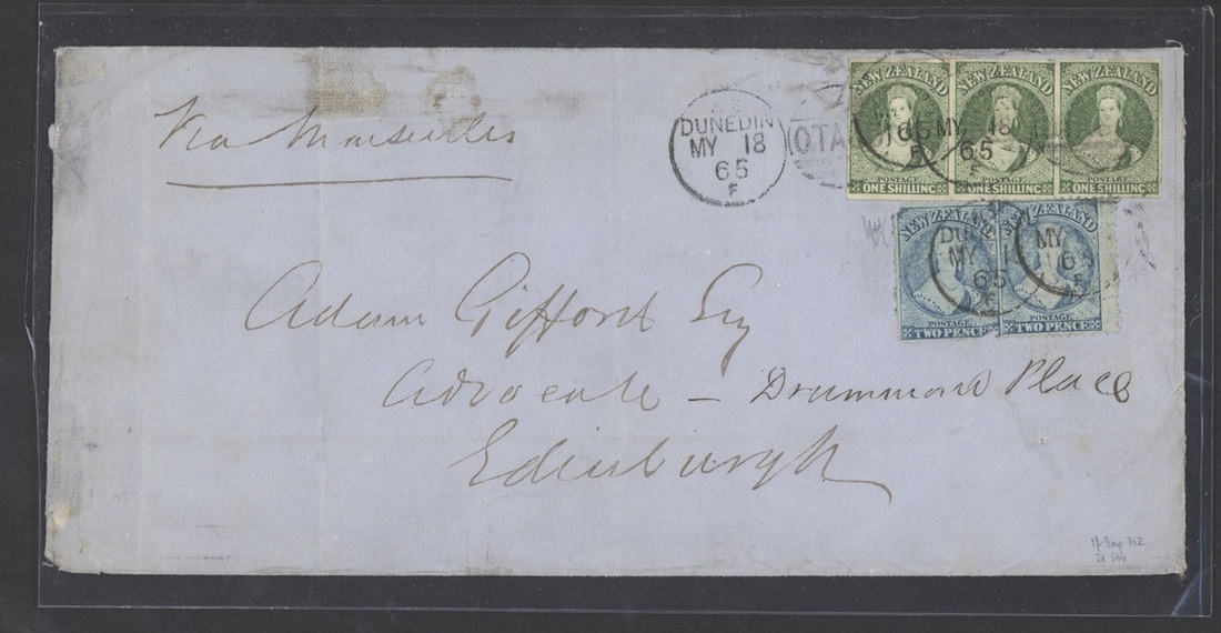 1865 (18 May) quadruple rate envelope (221x102mm.) from Dunedin to Edinburgh, marked "Via Marseilles", bearing 1864 watermark