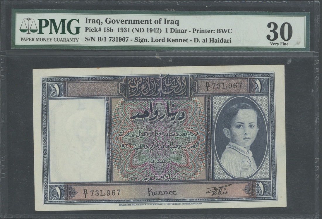 (x) Government of Iraq, 1 dinar, ND (1942), serial number B/1 731967, blue and lilac, King Faisal II as a child at right, value at each corner, signatures of Kennet and al Haidari, reverse blue
