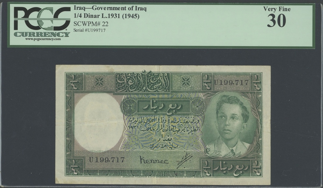 Government of Iraq, 1/4 dinar, law of 1931 (1948), prefix U, green, King Faisal II as a youth at right, Kennett and al Khudhairi signatures