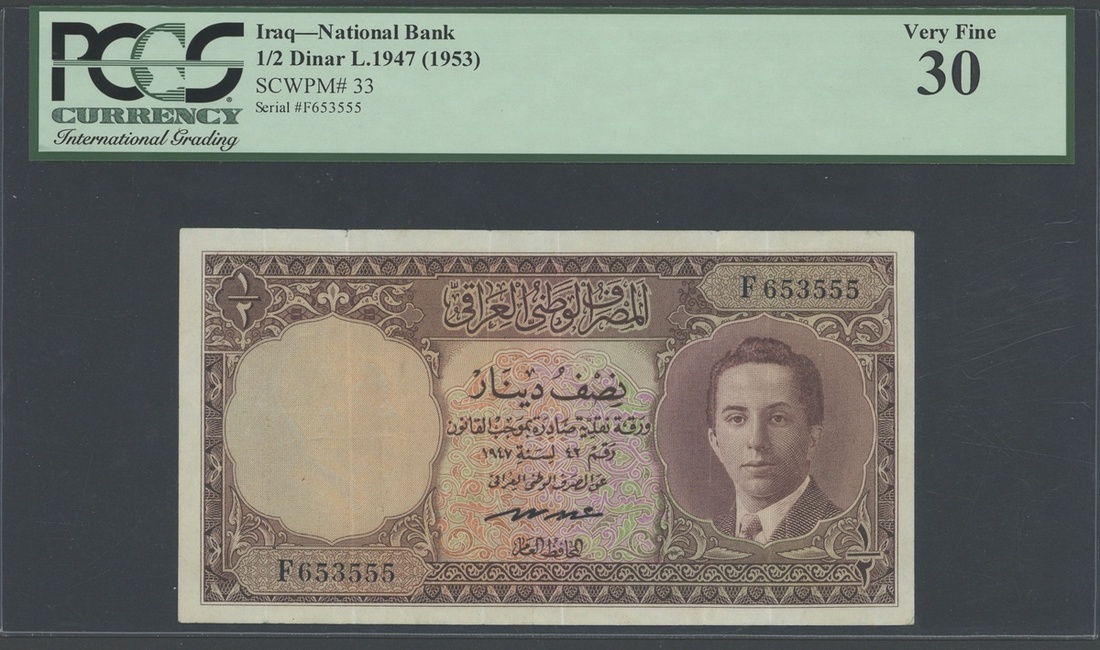 (x) National Bank of Iraq, 1/2 Dinar, L. 1947 ND (1953), serial number F653555, (Pick 30), tear at top left margin, in PCGS holder 30 Very Fine