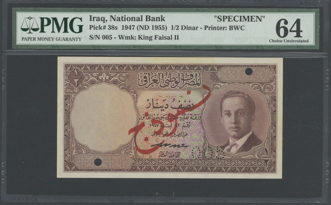 (x) National Bank of Iraq, specimen ½ Dinar, Law of 1947 (1955), no serial numbers, brown on multicoloured underprint, portrait of adolescent King Faisal II at right, signature of Abdul Ilah Hafudh, reverse spiral minaret and ruins of the Great Mosque at Samarra at centre, denomination in ornate pattern at left, watermark large head
